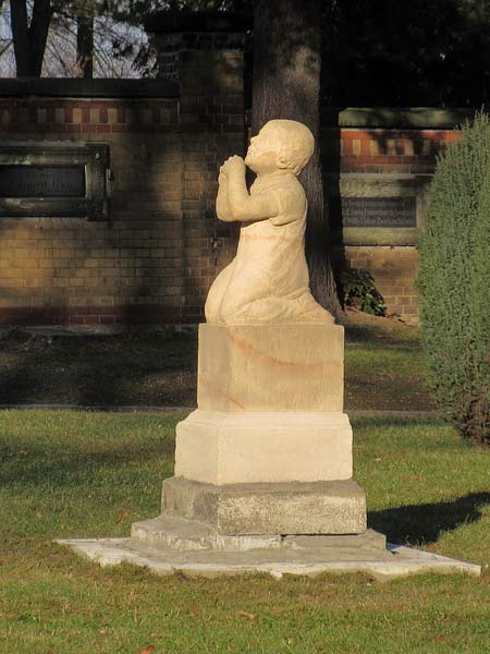 das Kindergrab wurde renoviert, die Patina von 100 Jahren wurde weggestrahlt, nun sieht es wieder "ordentlich" aus. 100 Jahre schaute das Kind in den Sonnenaufgang, nun schaute es in den Untergang und betet. hier hat man versucht, die scheußliche grüne Patina zu verhindern, hat aber nicht geklappt |